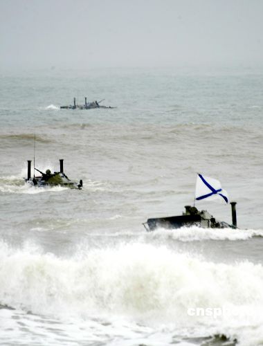圖:中俄聯(lián)合軍演 陸戰(zhàn)隊(duì)員乘裝甲運(yùn)兵車實(shí)施兩棲登陸