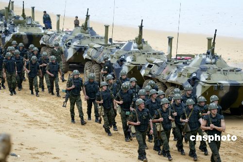 八月二十四日,山東半島雨水不斷,“和平使命—2005”中俄聯合軍事演習兩棲登陸作戰實兵演練如期進行。圖為完成登陸任務后的俄羅斯陸戰隊員,在海邊等待裝船返航。作者:王麗南