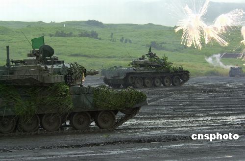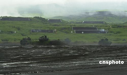 日本陸上自衛隊二十五日在位于富士山麓的靜岡東富士演習場舉行二00五年度綜合火力演習。共出動人員約二千名,戰車約六十輛,各類火炮約四十門,飛機約二十架,其他車輛約四百輛。作者:王健