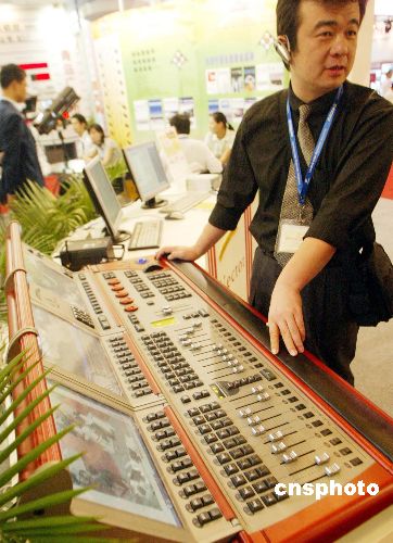 八月二十七日,正在北京舉行的“第十四屆北京國際廣播電視電影設備展覽會”吸引來自美國、英國、法國、日本以及中國六百余家客商參展,展會還舉行國際技術交流,相互傳遞數字廣播電視電影業的新信息,提高中國在數字化電影、電視技術的國際地位和影響。圖為參展商展示最新影視、廣播設備。作者:錢興強