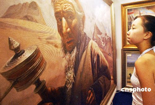 八月二十八日,正在北京舉行的“2005中國藝術博覽會”上,匯集了來自中國各地的百家藝術品經營機構和五百名中外藝術家,參展作品有中國畫、油畫、版畫、書法、雕塑及綜合藝術材料、美術出版物,圖為展會上醒目的西藏攝影作品吸引參觀者。作者:錢興強