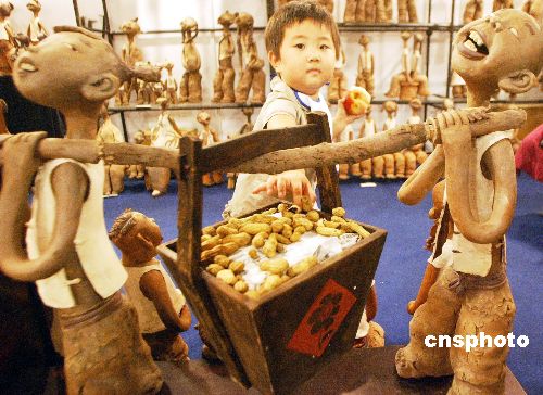 八月二十八日,正在北京舉行的“2005中國藝術博覽會”上,匯集了來自中國各地的百家藝術品經(jīng)營機構和五百名中外藝術家,在參展的作品中別具特色中國陶藝藝術品引人注目。圖為由中央美術學院藝術研究院的鄭玉奎創(chuàng)作的陶藝作品《農家樂》充滿濃厚的鄉(xiāng)土氣息,造型活潑、生動感人。作者:錢興強