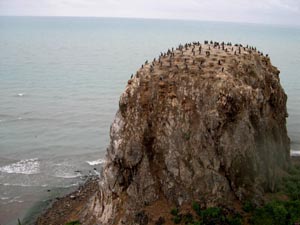 著名的青海湖鳥島由鸕鶿島和蛋島兩部分組成,每年春天,數以10萬計的普通鸕鶿、斑頭雁、棕頭鷗、魚鷗、燕鷗、大天鵝等十幾種鳥,從印度、盂加拉灣、恒河口、吉大港等地經過數千公里的長途飛翔,成群結隊從南方飛來,棲居島上。它們各自選擇舒適的地方,筑巢安家,求偶產卵,孵育雛鳥,鳥群此起彼落,把島遮蓋得嚴嚴實實。圖為鸕鶿島東側的由一片懸崖峭壁組成的“鸕鶿城堡”。