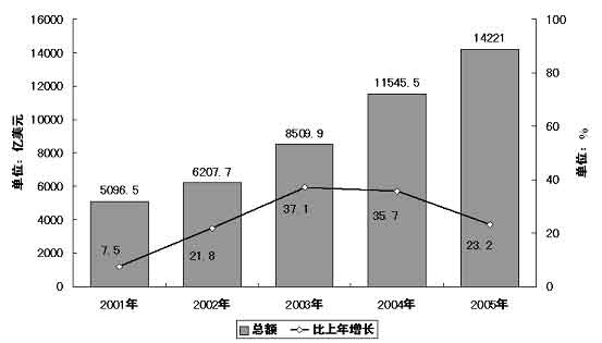 圖表五 “十五”期間外貿進出口總額及其增長情況