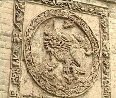 照壁中間的磚雕為一獨角猛獸,稱之為獨角獸,又名“廌”(音制),倉頡造“法”字便是根據獨角獸而造的,古代法字寫為“”,意為“廌”頂去不平使其呈水平狀謂之為法。獨角獸能明是非,辯曲直,見兩人爭斗時,就用獨角攻擊邪惡的一方。正因為它有這種特點,所以附近天氣常年干旱,天上稍有烏云,它就要將云頂散。因此當地群眾在日久不見雨過于干旱時,就用泥巴將獨角獸“泥”起來,他們認為將獨角獸用泥擋住,它便看不見天上的云,云就會聚集起來下雨,事實上這種看似迷信的乞雨方法從古到今在當地卻很靈驗。