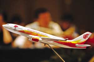 昨天,奧運專機模型首次亮相。從整體看,專機“身”著紅黃相間的外衣;從局部看,機身前面的一側畫著兩個火炬手高舉熊熊燃燒的奧運圣火的圖案,下面是“北京2008”和奧運會五環的標志。