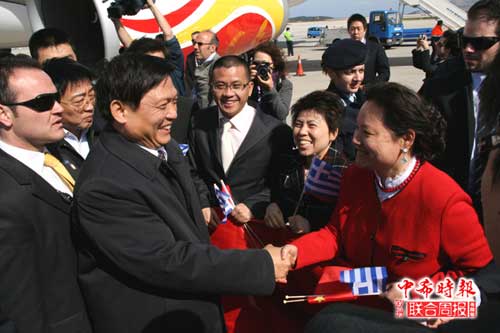 當地時間29日下午14時45分(北京時間晚上20時45分),中共中央政治局委員、北京市委書記、北京奧組委主席劉淇率北京奧運圣火交接儀式代表團乘坐北京2008奧林匹克火炬接力包機“和諧之旅”號抵達雅典,出席于30日下午在這里舉行的北京奧運會圣火交接儀式。(中希時報 汪鵬攝)