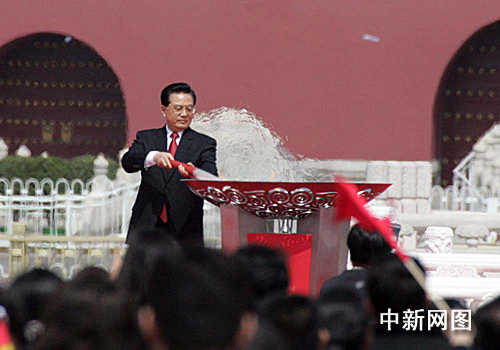 3月31日,北京奧運(yùn)會(huì)圣火歡迎儀式暨傳遞啟動(dòng)儀式在北京天安門廣場(chǎng)啟動(dòng)。圖為胡錦濤主席在眾人的注視下,用火炬點(diǎn)燃圣火盆。中新社發(fā) 張宇 攝