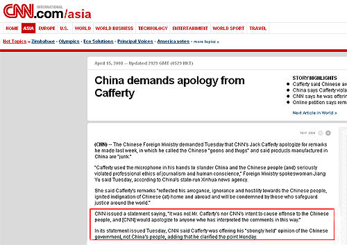 在CNN網站首頁中部的“Popular News”欄目中,刊登了《China demands apology from Cafferty(中國要求卡弗蒂道歉)》一文。文章前三段陳述了中國外交部對卡弗蒂言論的指責及要求卡弗蒂道歉的情況,在第四段中這樣說:CNN發表了一份聲明稱:“不論是卡弗蒂先生本人,還是CNN,都無意冒犯中國民眾;在這里,我們愿向受到此言論影響的人們道歉。”