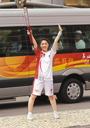 楊千嬅是澳門區(qū)火炬手代表之一,其父母也專程去為她打氣,可惜由于站錯了等候的位置,以致其父母看不到她拿著火炬一刻的跑姿,令兩老也感失望。