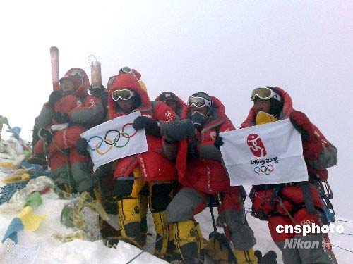 5月8日,北京奧運圣火珠峰傳遞登山隊成功登頂珠穆朗瑪峰。這是登山隊員在峰頂展示“祥云”火炬、火種燈、中國國旗、奧運五環旗和北京奧運會會徽旗。中新社發 阿旺扎西 攝