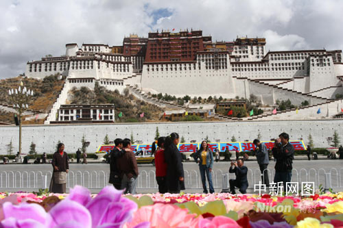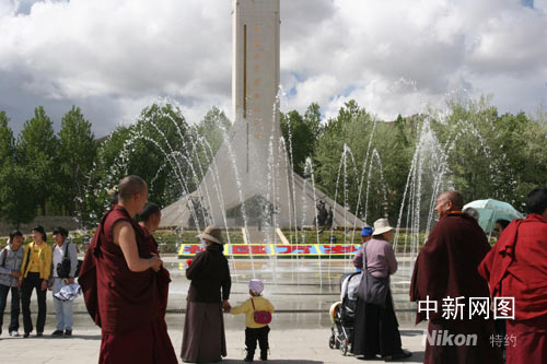 平日只在夜間開放的布達拉宮廣場音樂噴泉,今日破例在白天開放。廣場上用鮮花搭建的“民族大團結、齊心迎奧運”等三組奧運主題景觀,把不是節日勝似節日的廣場裝點得花團錦蔟。廣場上西藏和平解放紀念碑前,幾位紅衣喇嘛正在接受媒體采訪。日前他們曾專門舉辦過“祈愿世界和平、祝福北京奧運”主題法會。年紀稍長的一位喇嘛說!氨本⿰W運會圣火今天成功在珠峰點燃,激發了中華民族的自豪感。聽說珠峰傳遞結束后,圣火火種將在拉薩與西藏境內傳遞的主火種會合。這又是一次民族團結的象征,必將彰顯示中華民族傳統的‘和合’理念。”