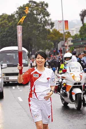 已懷孕7個(gè)半月的李穎詩(shī),曾連續(xù)10年成為香港游泳項(xiàng)目的紀(jì)錄保持者,1994年更在廣島亞運(yùn)中勇奪銀牌。運(yùn)動(dòng)員生涯過去了,她繼續(xù)為香港體育發(fā)展努力,現(xiàn)擔(dān)任運(yùn)動(dòng)推廣工作;她笑指去年報(bào)名參加火炬手甄選時(shí)還未懷孕,當(dāng)獲通知擔(dān)任第56棒火炬手時(shí),她既感興奮,也擔(dān)心身體未能應(yīng)付,幸好獲醫(yī)生及家人的支持,終鼓起勇氣與女兒共度傳送圣火的歷史時(shí)刻,“傳送時(shí)女兒也在腹中團(tuán)團(tuán)轉(zhuǎn),手仔腳仔也在動(dòng),她陪著我一同完成了圣火傳送的任務(wù)”。