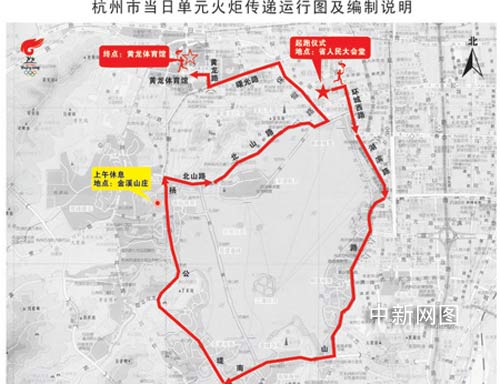 據悉,杭州段的火炬接力傳遞活動于五月十八日上午八點整將在浙江省人民大會堂東門外廣場舉行起跑儀式,主要環繞杭州西湖進行傳遞,同時還將經過雷鋒夕照、柳浪聞鶯、湖濱路名品街、西湖博覽會博物館等杭州的地標建筑和著名景點,最后將于十一點半在杭州黃龍體育館舉行奧運火炬接力杭州站結束儀式,全程預計歷時三小時四十五分鐘,被定名為“和諧之旅——生活品質之路”。