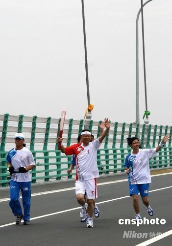 5月22日,奧運火炬傳遞寧波站最后一棒火炬手嚴宏軍,高舉火炬跑過杭州灣跨海大橋。這是全世界跨度最長的跨海大橋,嚴宏軍是這座大橋的建設者之一。 中新社發 周兆軍 攝