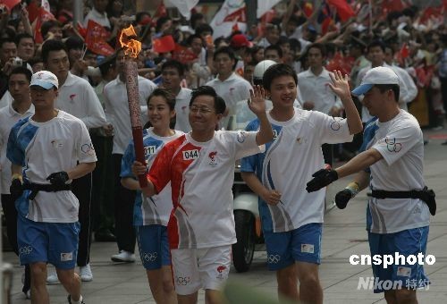 五月二十三日,中國(guó)乒乓名將姚振緒在上海繁華的南京路傳遞奧運(yùn)火炬,受到上海市民歡迎。 中新社發(fā) 潘索菲 攝