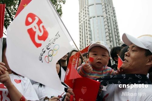 五月二十三日,奧運火炬開始上海站傳遞,未滿周歲的上海幼童也加入上海市民迎接圣火的行列。 中新社發 潘索菲 攝