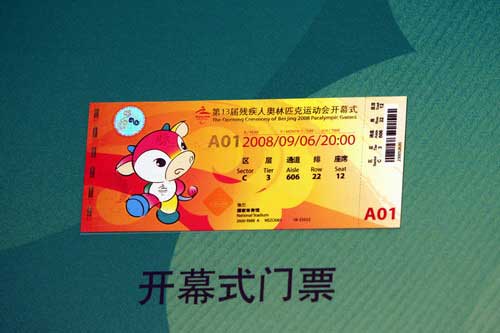 殘奧門票包括殘奧會開幕式門票、閉幕式門票、體育比賽紀念票、熱敏票,大體的方式跟奧運會的類別是一樣的。不過,設計體現殘奧會的精神,開、閉幕式主要圖案是殘奧會的吉祥物,即以“福牛樂樂”為主要的元素。