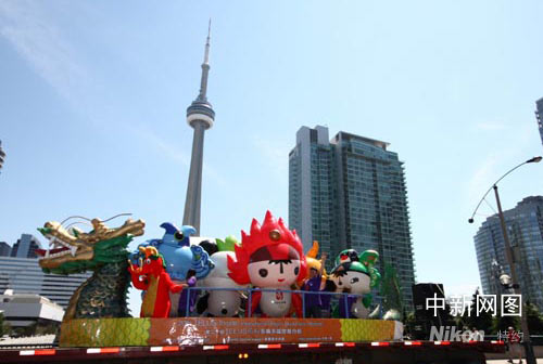 中新網多倫多6月21日電 今天,北京奧運吉祥物“五福娃”參加了在多倫多中央島舉行的第20屆多倫多國際龍舟節開幕典禮,加拿大三大政黨要員、5000名各國龍舟健兒以及超過10萬名觀眾感受到了北京奧運的熱情與祝福。