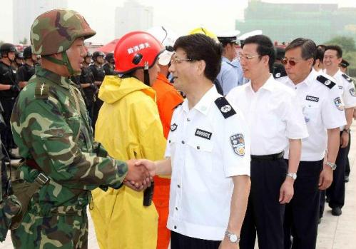 北京奧運安保工作協調小組組長、公安部黨委副書記、副部長劉京,國務院副秘書長汪永清,國家反恐辦主任、公安部黨委委員、副部長孟宏偉和天津市委副書記、市長黃興國等領導一同觀看了演習。(徐燦)