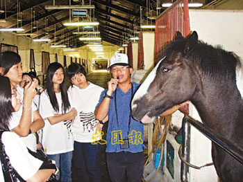 在參觀馬房時,30多名中學生都好奇地東張西望,大部分都是第一次跟馬匹如此近距離地親密接觸,女生都忍不住鼓起勇氣摸摸馬頭馬頸,“它好溫馴啊!”張琪琪一邊撫摸馬匹,一邊開心地說。