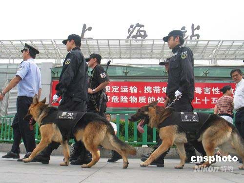 為了提高鐵路安保等級,確保奧運期間鐵路運輸和旅途安全,從7月24日起,鐵路警方抽調(diào)特警小分隊進駐上海站廣場,攜警犬晝夜巡邏。中新社發(fā) 陳煥聯(lián) 攝
