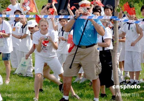 7月14日,奧運火炬在吉林長春傳遞。當地外國友人在路線沿途熱情觀看奧運火炬傳遞。中新社發 廖攀 攝
