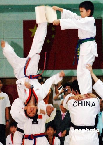 中國跆拳道小運動員在北京什剎海體校跆拳道訓練館,為29名將執法北京奧運會的裁判員做精彩表演。中新社發 王東明 攝