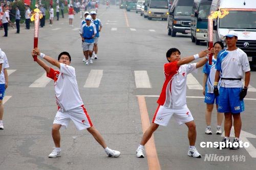 7月15日,奧運火炬在吉林松原傳遞。火炬手屈萬日(右)、張世民以優美姿態交接火炬。中新社發 廖攀 攝