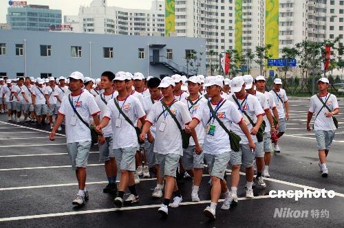 7月15日早上,駐京海軍某部300名官兵身著統(tǒng)一服裝到鳥(niǎo)巢參加奧運(yùn)開(kāi)幕式彩排。據(jù)了解,北京奧組委采取嚴(yán)格的保密措施防止開(kāi)幕式節(jié)目?jī)?nèi)容泄露,為此“鳥(niǎo)巢”外圍戒備森嚴(yán),共有三層隔離護(hù)欄,由公安、武警把守。“鳥(niǎo)巢”上空的制高點(diǎn)也被全面封鎖,防止高空偷拍。 中新社發(fā) 楊慧峰 攝