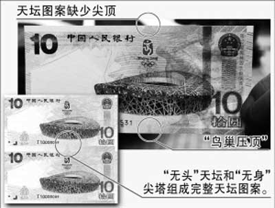 由于央行在發行公告中僅籠統稱,正面印有天壇和國家體育場的圖案,因此,無從得知這是否一種刻意而為的藝術設計。