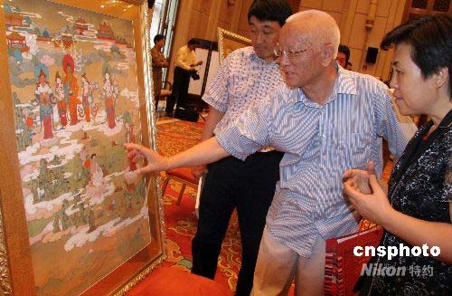 中國社會科學院《格薩爾》研究中心主任、中國《格薩爾》學學會會長降邊嘉措研究員(中)向人們介紹中華民族藏文化藝術(shù)珍品的格薩爾唐卡作品。中新社發(fā) 孫自法 攝