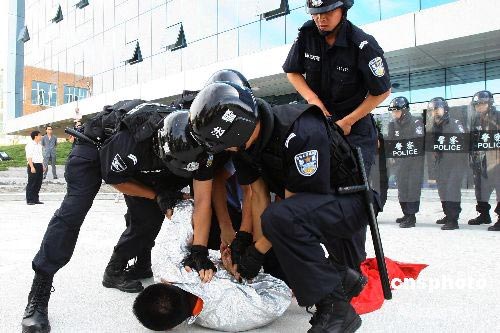 北京奧運村法庭舉行奧運安保演練 ,發生“突發事件”時,法警控制住鬧事的“當事人”。中新社發 劉新 攝