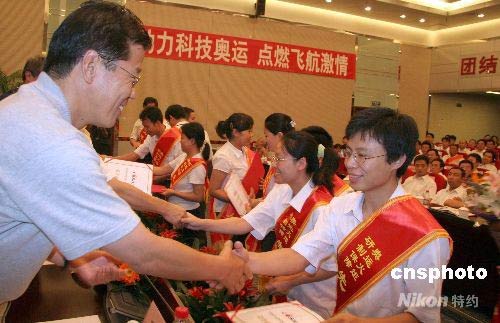 7月18日,承擔北京奧運火炬研制任務的中國航天科工集團第三研究院在北京舉行總結和頒獎大會,對該院奧運火炬研制及技術保障團隊進行表彰。據悉,在借鑒火箭發動機技術的基礎上,北京奧運火炬燃燒系統大膽創新,各項指標都遠遠超出北京奧組委設計要求,多項技術世界首創,并已經申請十幾項專利。 中新社發 孫自法 攝