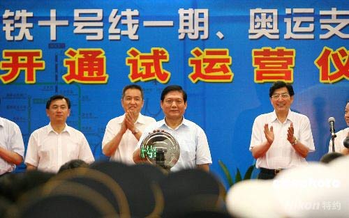 7月19日,北京地鐵10號線(一期)、奧運(yùn)支線、機(jī)場線開通試運(yùn)營儀式在地鐵10號線與奧運(yùn)支線交匯的北土城站舉行。中共中央政治局委員、北京市委書記、北京奧組委主席劉淇啟動三條地鐵線路。 中新社發(fā) 富田 攝