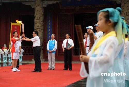 7月22日,奧運火炬在孔子故里山東曲阜傳遞,孔子74代孫孔鵬在曲阜孔廟大成殿前傳遞首棒奧運火炬。 中新社發(fā) 廖攀 攝