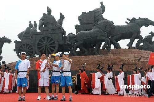 7月22日,奧運(yùn)火炬結(jié)束在山東曲阜傳遞。圖為在孔子列國行雕塑前護(hù)衛(wèi)從曲阜末棒火炬手宮治華手中收回火種。 中新社發(fā) 廖攀 攝