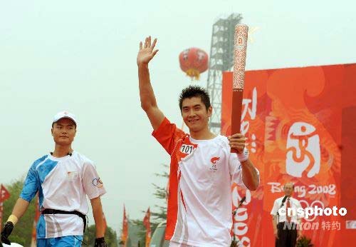7月22日上午11點30分,隨著首棒火炬手——著名體操運動員邢傲偉高舉“祥云”火炬在泰安體育中心廣場起跑,北京奧運火炬接力泰安站傳遞活動正式開始。中新社發 廖攀 攝