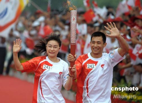 7月23日,奧運火炬在山東濟南傳遞,中國跳水隊運動員、世界冠軍郭晶晶、王峰共同傳遞濟南最后一棒火炬。 中新社發 廖攀 攝