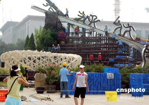 7月23日,北京天安門廣場東側(cè)建設(shè)中奧運(yùn)主題花壇輪廓已趨鮮明,游客紛紛在此合影留念。今年天安門廣場奧運(yùn)花壇創(chuàng)下歷年之最,花材用料最多,達(dá)到100萬盆,80余種,工程將于26日全部完工。 中新社發(fā) 張雙雙 攝