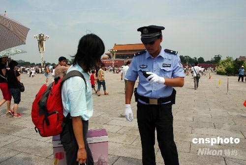 近日,奧運(yùn)臨近,天安門廣場(chǎng)民警對(duì)游客攜帶物品檢查越來越嚴(yán)格。圖為巡邏的民警正在盤查游客包裹,以保障奧運(yùn)會(huì)順利進(jìn)行。中新社發(fā) 張雙雙 攝