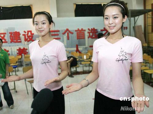 7月24日,中外記者前往北京昌平職業學校探營,19歲雙胞胎姐妹花李子曄、李曉曄,在眾多頒獎禮儀志愿者中分外搶眼。自2008年7月12日,337名身材修長、面容嬌美的頒獎儀式專業志愿者開始北京奧運會頒獎禮儀工作的沖刺培訓。較之以往,此次培訓除了頒獎禮儀動作、形體訓練,特別增加了奧運安保、拓展運動和藝術觀摩等課程。本月26日,這批志愿者將到各個場館進入賽前實地訓練。 中新社發 杜燕 攝