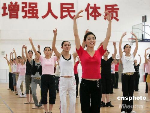 7月24日,奧運頒獎儀式志愿者們在北京接受禮儀基礎培訓。較之以往,此次培訓除了頒獎禮儀動作、形體訓練,特別增加了奧運安保、拓展運動和藝術觀摩等課程。中新社發 杜燕 攝