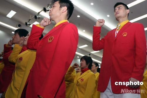 姚明、劉翔、朱啟南等面對國旗莊嚴宣誓。 中新社發(fā) 任晨鳴 攝