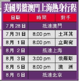 美國(guó)男籃澳門(mén)上海熱身行程。(圖片來(lái)源:澳門(mén)日?qǐng)?bào))