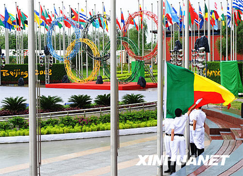 29日上午,北京微風(fēng)徐徐,氣候十分涼爽。11點(diǎn),奧運(yùn)村為貝寧代表團(tuán)舉行了升旗儀式,這也是首個舉辦這一儀式的外國代表團(tuán)。