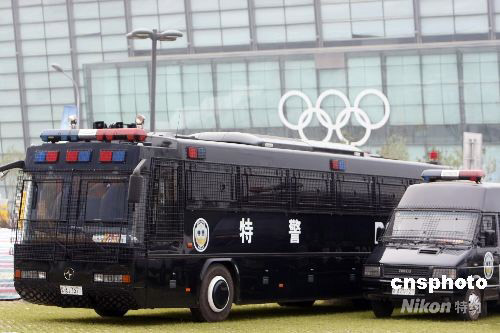 第29屆夏季奧運會開幕式在北京國家體育場“鳥巢”進行封閉式彩排,場外特警防暴車嚴加警戒。 中新社發 杜洋 攝