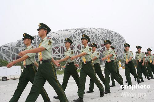 第29屆夏季奧運會開幕式彩排在北京國家體育場“鳥巢”內封閉進行,武警、特警現場戒備,保安嚴密。 中新社發 武仲林 攝