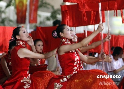 7月30日,北京奧運(yùn)會(huì)開幕式在“鳥巢”進(jìn)行彩排,穿著華麗的女引導(dǎo)員在場外靜候入場。 中新社發(fā) 杜洋 攝