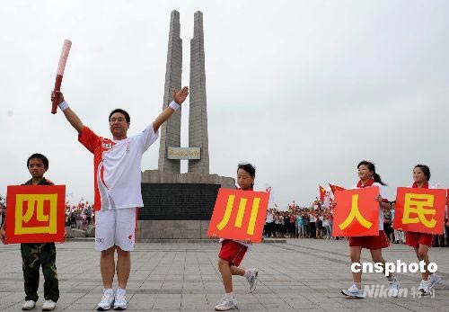 7月31日,奧運火炬在河北唐山傳遞。在唐山抗震紀念碑廣場,火炬手、抗震志愿者宋志永在來自四川震區的兒童前展示奧運火炬。四川地震發生時宋志永自發前往地震災區參與救援行動,徒手刨出5個遇難孩童的遺體。 中新社發 廖攀 攝